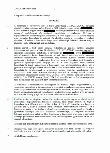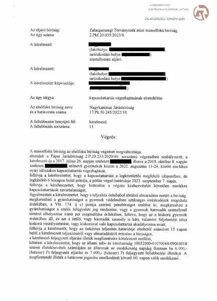 A Fővárosi Törvényszéket követően a Zalaegerszegi Törvényszék mint másodfokú bíróság is azon álláspontra helyezkedett, miszerint a kapcsolattartásra a gyermek okmányait a gondozószülő átadni köteles.